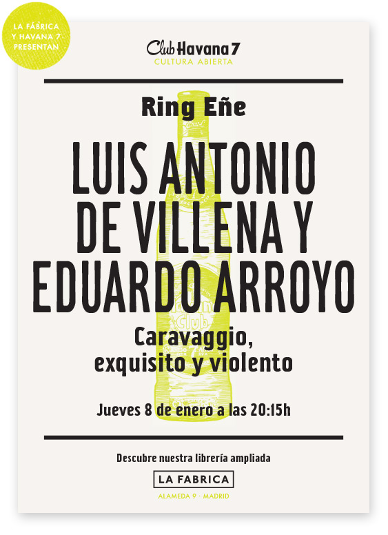 Mañana, jueves 8 de enero a las 20:15 horas, el Club Havana 7 Cultura Abierta presenta un nuevo Ring Eñe que acoge la presentación del libro titulado «Caravaggio, exquisito y violento», de la editorial Cabaret Voltaire. Para ello contarán, en nuestro espacio de La Fábrica, con su autor Luis Antonio de Villena, junto con el pintor Eduardo Arroyo, quienes mantendrán una charla sobre la figura y obra de Caravaggio.