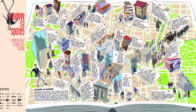 El mapa cultural ha sido ilustrado por Gonzalo Izquierdo y cuenta con el texto de apertura del escritor Carlos Mayoral, que ofrece su mirada sobre el autor en la inauguración de su estatua en el parque del Buen Retiro. Entre los lugares que forman parte de la ruta galdosiana se encuentran la Universidad Central, el Teatro Español, la Plaza Mayor, Lhardy y la redacción de El Debate, el diario que dirigió entre 1871 y 1873.