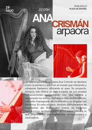 La artista jerezana Ana Crismán es la sensación musical de 2025 y la única persona en el mundo que compone e interpreta música flamenca con arpa, actuará en Robledillo de la Vera el martes 29 de julio. Interpretará los temas de su primer álbum Arpaora y estará acompañada por Isabel Cámara que leerá poemas extraídos del Romancero Gitano de Federico García Lorca.